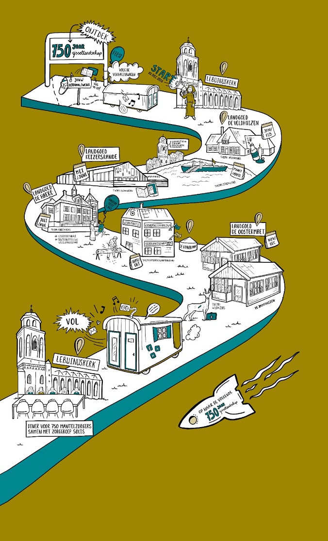 Het jubileumjaar sluiten IJssellandschap en Zorggroep Solis gezamenlijk af op 22 december a.s. in de Lebuinuskerk in Deventer met een feestelijk diner voor 750 mantelzorgers. Ook De Verhalenwagen zal gevuld met alle souvenirs zijn reis over de landgoederen daar afsluiten. Bent u een mantelzorger of wilt u een mantelzorger aanmelden voor het diner in de Lebuinuskerk zie: www.mantelzorgdiner2017.nl