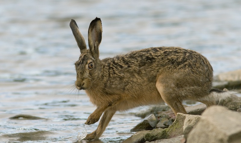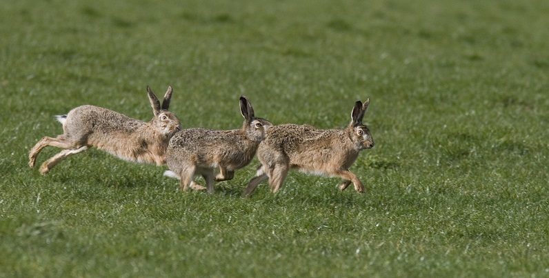 Even een aantal ‘hazentermen’: Je ziet ze momenteel dollend door het weiland, bolderen heet dat. Normaal gesproken leven hazen redelijk solitair maar in de rammeltijd, de paartijd die ongeveer in februari begint en tot augustus duurt, zie je soms groepjes voorbij sjezen en bokkesprongen maken. De rammelaars (de mannetjes) rennen achter elkaar aan en vaak jagen ze de moeren (de vrouwtjes) op. Aan elke rammelaar is een moer gekoppeld, maar er zijn ook ‘bijhazen’ die hun kans afwachten om een moer over te nemen. Als dit de rammelaar niet bevalt worden er complete bokswedstrijden uitgevochten. Tsja, en het is regelmatig raak bij die hazen; gemiddeld werpt een moer 3 of 4 worpen met ca 12 jongen in totaal. De kleine haasjes zijn behaard en hebben in tegenstelling tot jonge konijntjes de oogjes direct open. De moeder verlaat al na een paar dagen de geboorteplek van de haasjes en komt dan meestal in de schemering terug om ze te zogen. De sterfte onder jonge hazen is zonder bescherming ook wel relatief hoog.