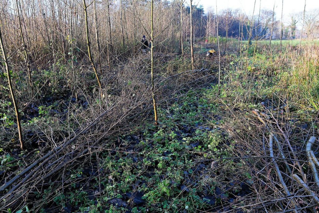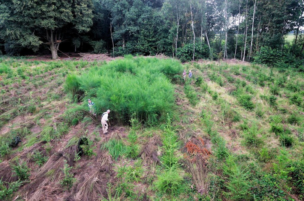 L. 2016 Het dennenbevrijdingsfront in actie en R. 2025 de bevrijde dennen torenen fier boven de vrijwilligers uit.