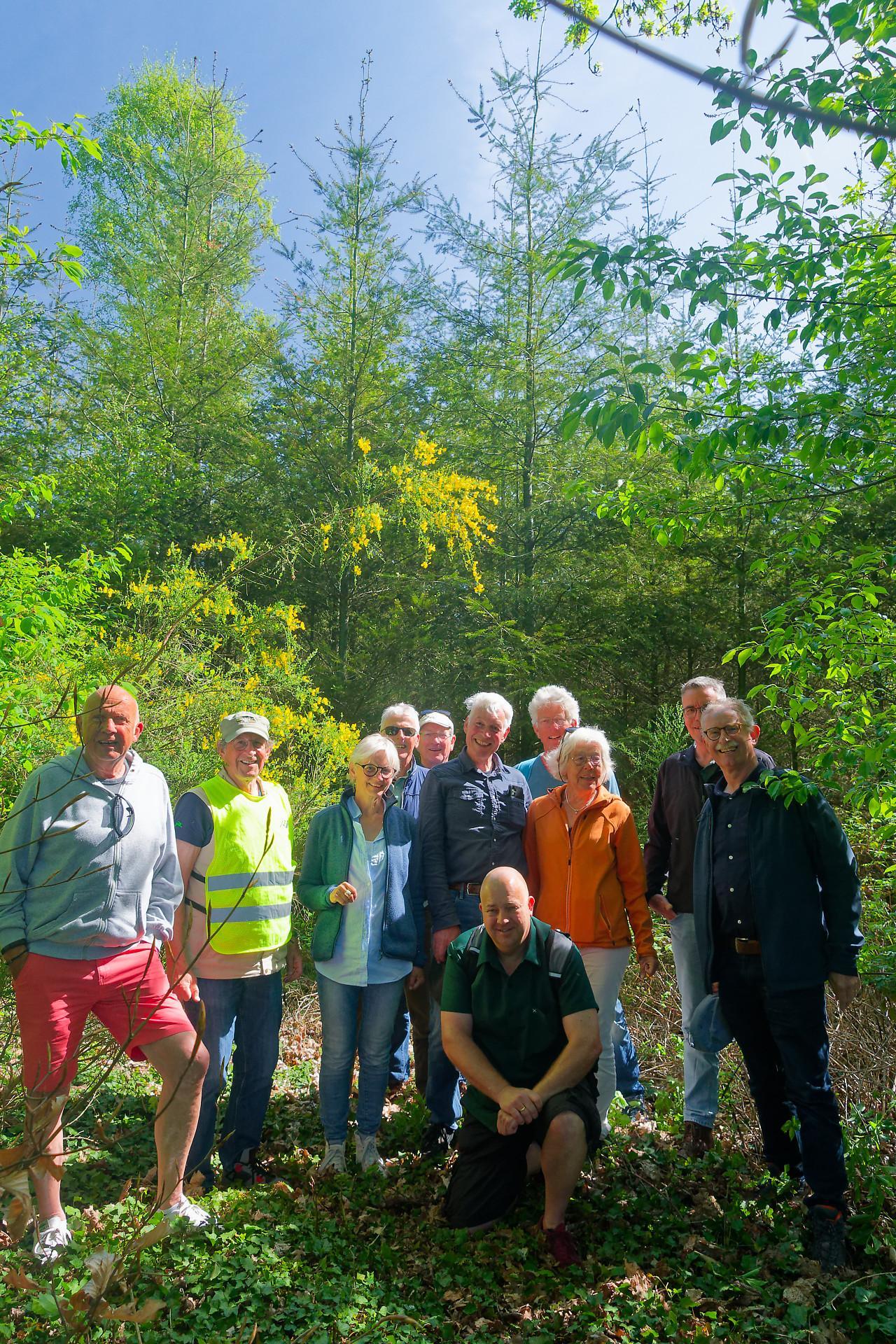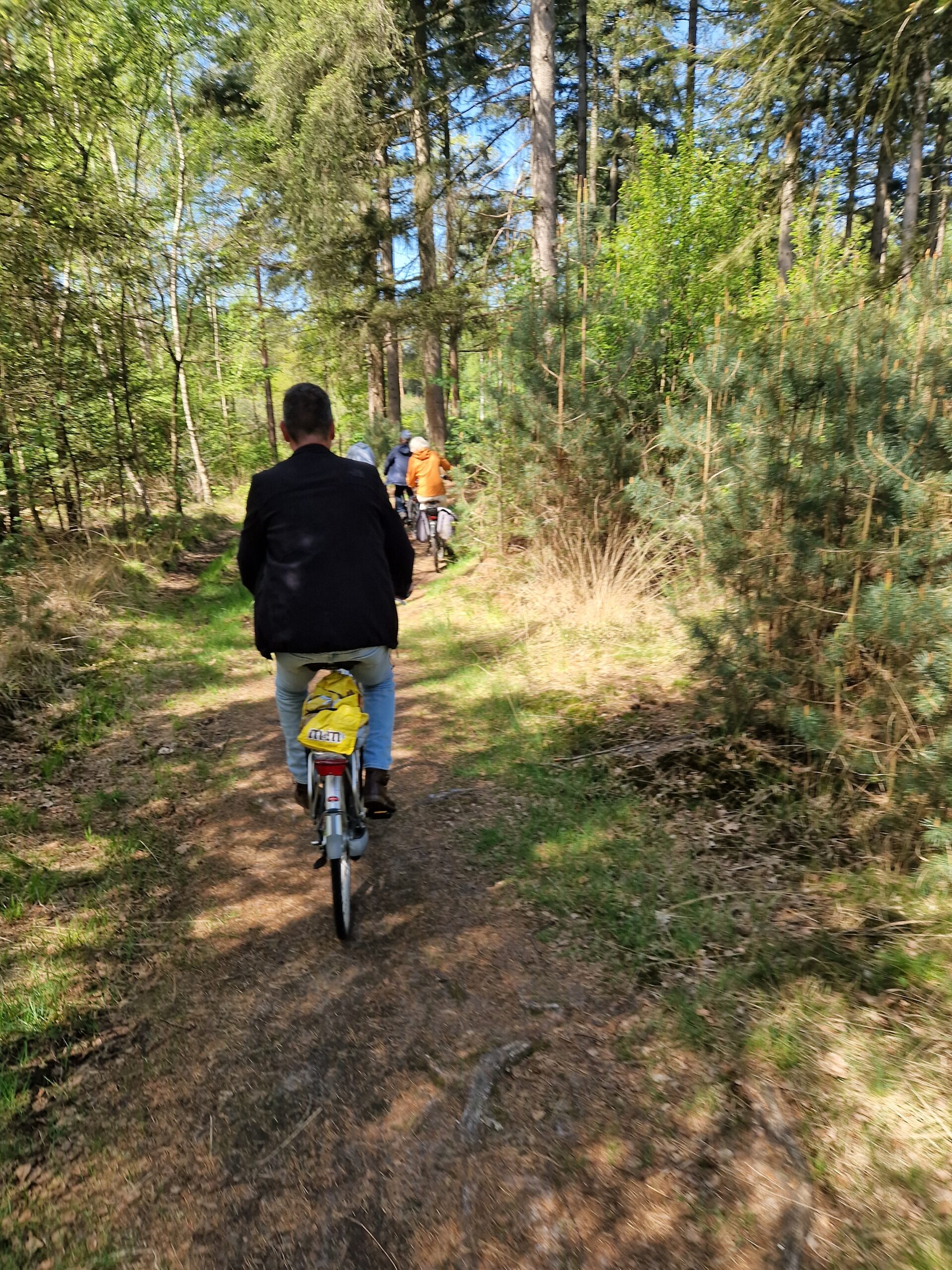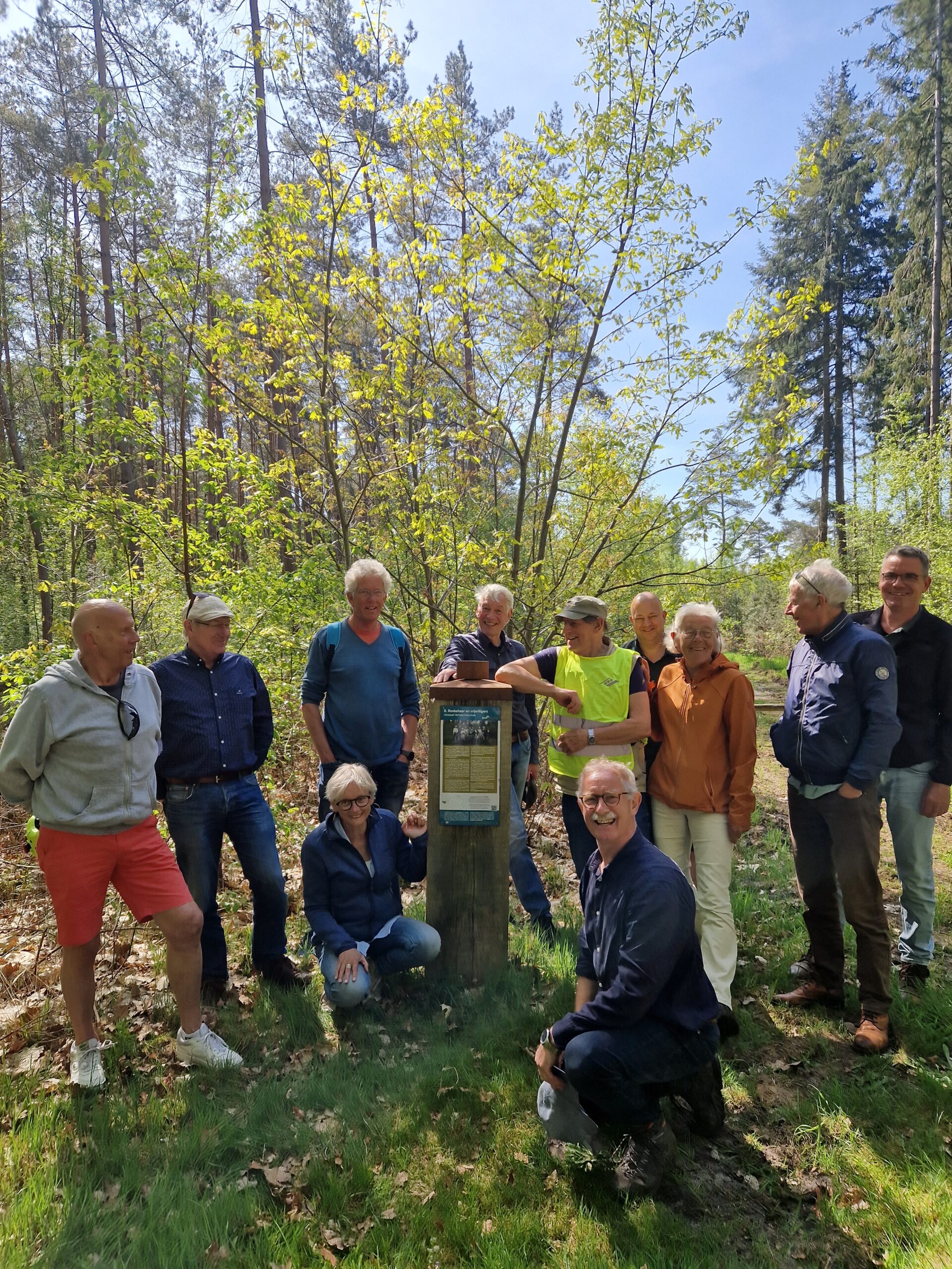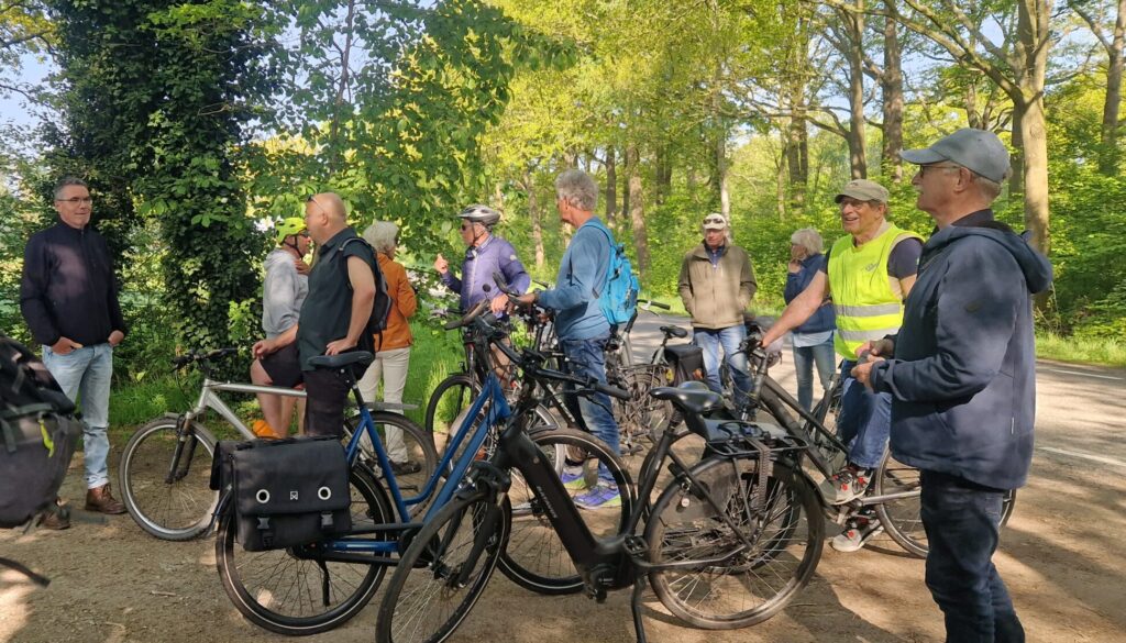 Onderweg bezochten we plekken waar de groep in de afgelopen jaren beheerwerkzaamheden heeft uitgevoerd. Zo kwamen we bij het stuk waar in 2016 de brem werd verwijderd om kleine dennetjes meer licht en ruimte te geven – destijds riep de groep zichzelf nog trots uit tot het Dennenbevrijdingsfront. Nu, bijna negen jaar later, torenen die bevrijde dennetjes dennen fier boven ons uit. Ook de populieren die ooit zijn vrij gezet, reiken inmiddels royaal richting de hemel. Een prachtig gezicht! Zo werd deze tocht een heuse resultatenfietsroute, waarop iedereen met eigen ogen kon zien hoe het werk van jaren geleden tot bloei is gekomen.