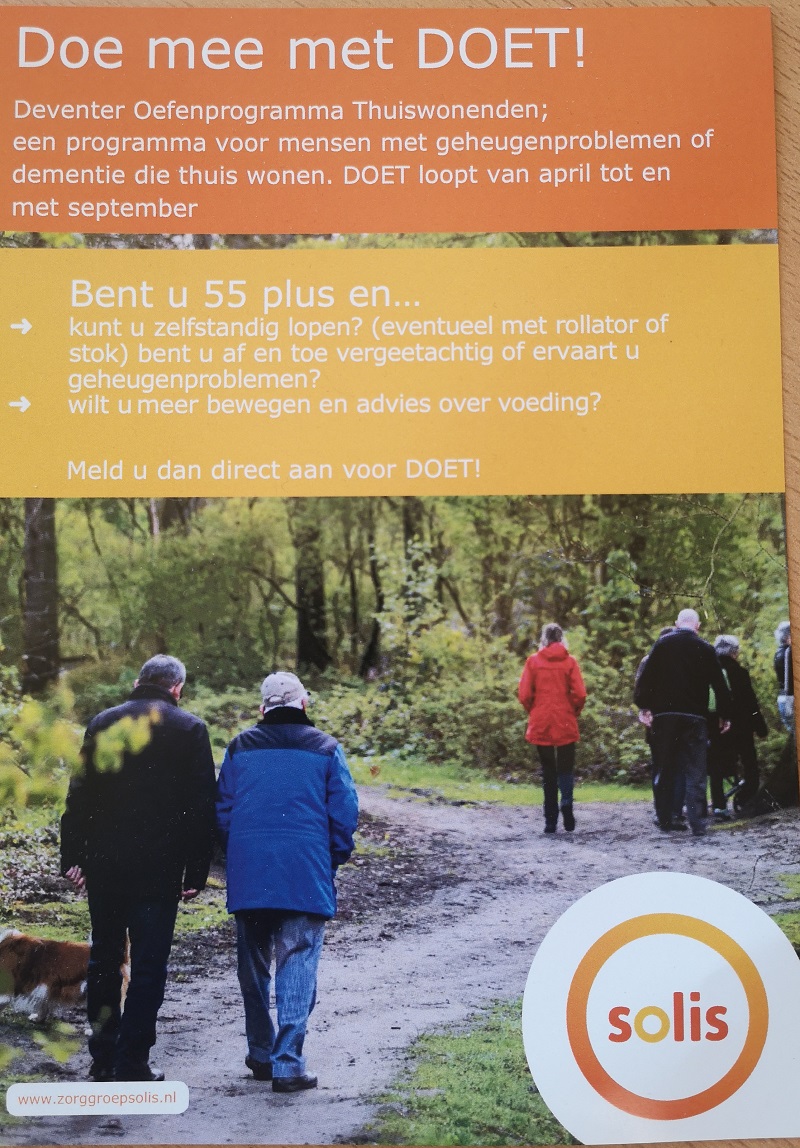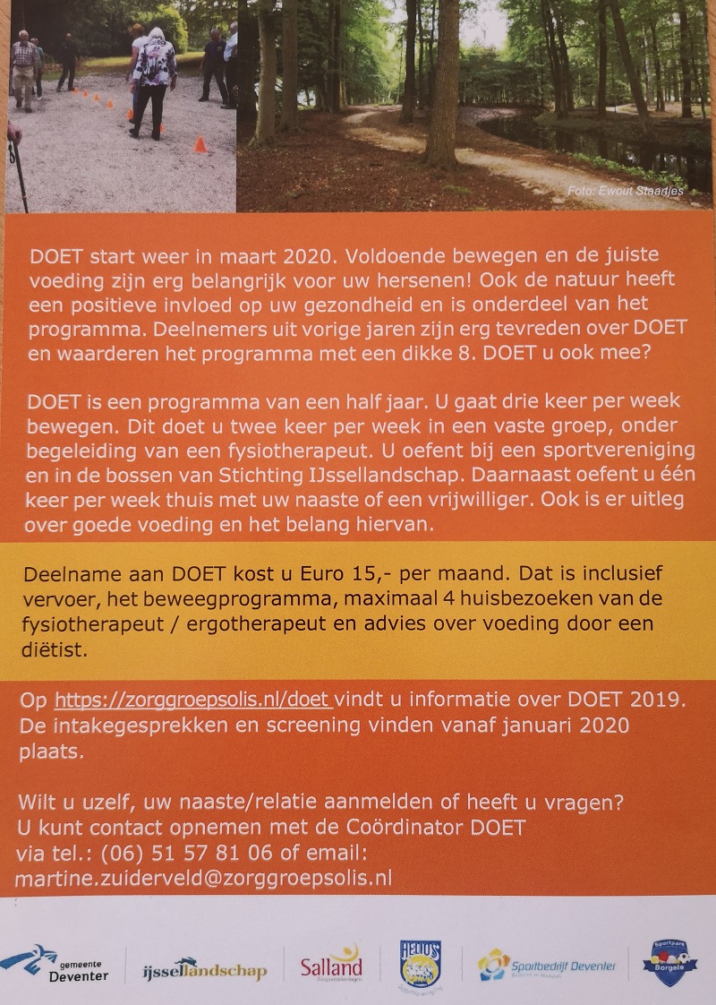 DOET is een programma waarmee we mensen met geheugenproblemen of dementie worden gestimuleerd (nog) meer te bewegen en gezond te eten. Het bewegen doen we 1 x per week in de natuur van het IJssellandschap.