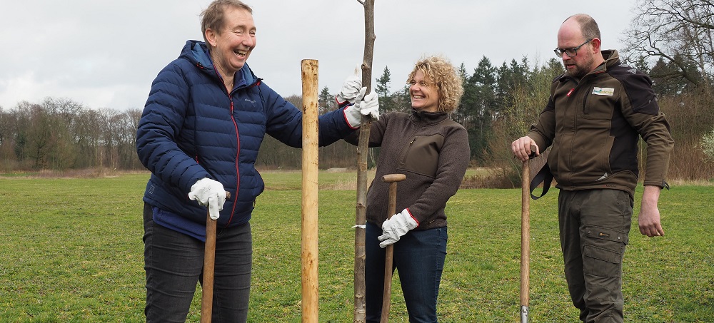 Els is dus sportief en wilde ook zelf komen planten. Dat deden we begin maart, en het was nog best een klus, de wortels moeten diep de grond in. Maar nu staan ze er en kunnen ze naar hartenlust groeien. Wie jarig is trakteert want de gift is natuurlijk ook eigenlijk een kadootje aan iedereen én aan haarzelf want zoals ze zelf aangeeft: “prachtig zoals IJssellandschap mij de kans gaf het verjaardagskado concreet te maken! Als we er met de bosgroep van Daventria langs hollen op de zaterdagmorgen kan ik nu ‘mijn’ bomen aanwijzen”. Tsja, dat is nog eens een duurzaam boeket! Dank, en nog van harte, Els!