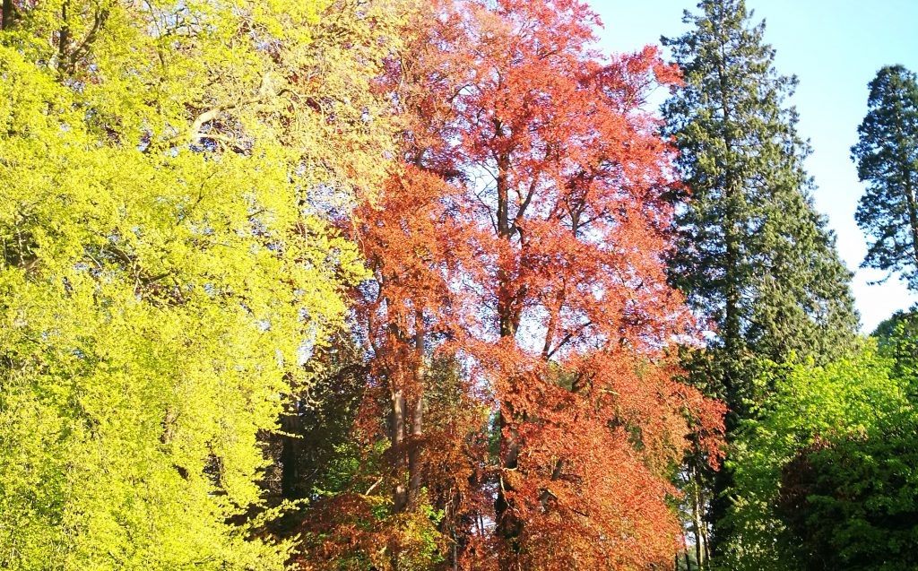Zo fiets je op een zonnige vrijdagmiddag in april vanaf je fantastische werkplek op landgoed De Haere het weekend tegemoet, verheugd glimlachend bij het zien van de veelbelovende lichte groene waas over de bomen, zo kom je op maandagochtend terug en blijkt opeens een zeer effectieve groene (en rode want we hebben een schitterende rode beuk naast de havezate staan) verfbom te zijn geëxplodeerd. Hoe is het mogelijk!