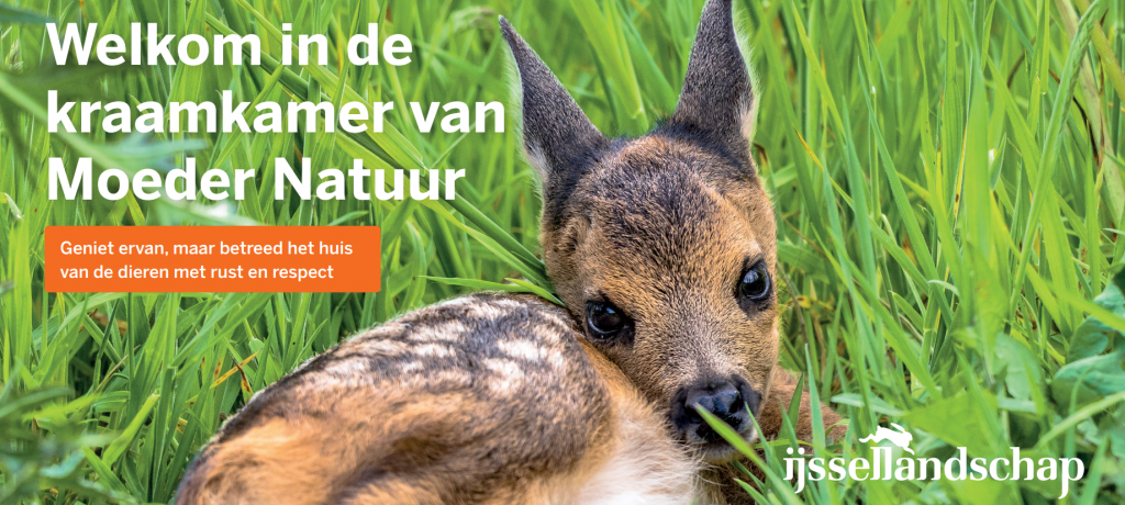 Als je op kraamvisite gaat, is het belangrijk om rust te waarborgen. Ook in de kraamkamer van Moeder Natuur! Om het publiek hierop te attenderen hangen we op een aantal van onze landgoederen tijdelijk een spandoek om de bezoekers te verwelkomen én ze bewust te maken van het feit dat ze in feite op ‘kraamvisite’ zijn. Een enkel gebied wordt tijdelijk afgesloten, vanwege de aard van het terrein. Dit geldt bijvoorbeeld voor het pad vanaf de Bolwerksweg in Deventer.