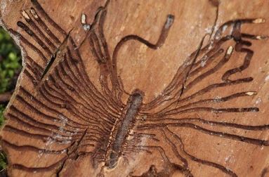 Het mannetje dat zich binnen heeft verschanst scheidt een stofje af waarmee hij vrouwtjes lokt. Die vrouwtjes leggen vervolgens een heleboel eitjes , waarna de larven zich allemaal een weg onder de bast vreten. Daardoor stagneert de sapstroom van de boom. Het eerste zie je dit meestal aan de top van de boom. Maar langzaam kleuren de takken bruin en sterft de boom af. En het gaat om een groot aantal bomen; van de 90 ha fijnspar is ongeveer de helft door deze kever aangetast.