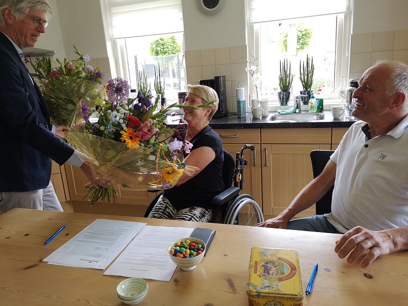 Het was even een gepruts (is t geen draaidop? werd er nog gegrapt) maar toen ging vroeg in de middag de kurk ook van de fles. Champagnefles wel te verstaan want ook boeren nemen tijd om te vieren, al gaat het werk straks gewoon door. Een tevreden Bertus en Minie Kerkmeijer gaven met een toost en het officieel ondertekenen van het pachtcontract de boerderij, eigendom van Burgerweeshuis en Kinderhuis (BWK) met daarnaast ook pachtgrond van IJssellandschap, aan de Lankhorsterweg in Wesepe over aan Giel (23 jr) en zijn vader Peter Aalbers. Minie: “’K heb een blij gevoel, het is helemaal goed zo al is het natuurlijk tegelijkertijd ook emotioneel’ waarop Bertus aanvult ‘ik help gewoon ook nog mee, maar de verplichting is weg. We weten dat het bedrijf in goede handen is. Het is ook mooi te weten dat het door onze grootouders in 1936 begonnen bedrijf als één bedrijf wordt doorgezet’ .