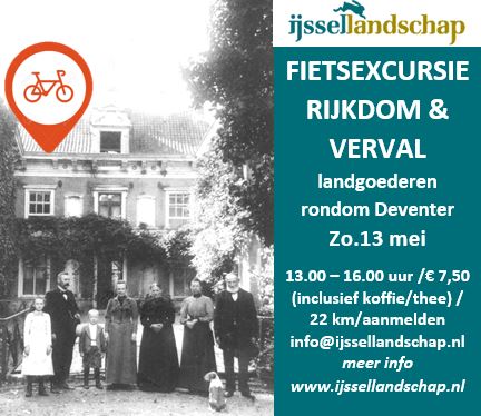 Bij deze fietsexcursie onder leiding van enthousiaste IJssellandschap gidsen, gaan we terug in de tijd en ontdekken we aan de hand van de verhalen van de voormalige bewoners de rijkdom en het verval van twee landgoederen: Landgoed Nieuw Rande /(Diepenveen) en Landgoed de Haere (Olst). U komt van alles te weten over het verleden en het heden van deze mooie plekken zo dicht bij Deventer.